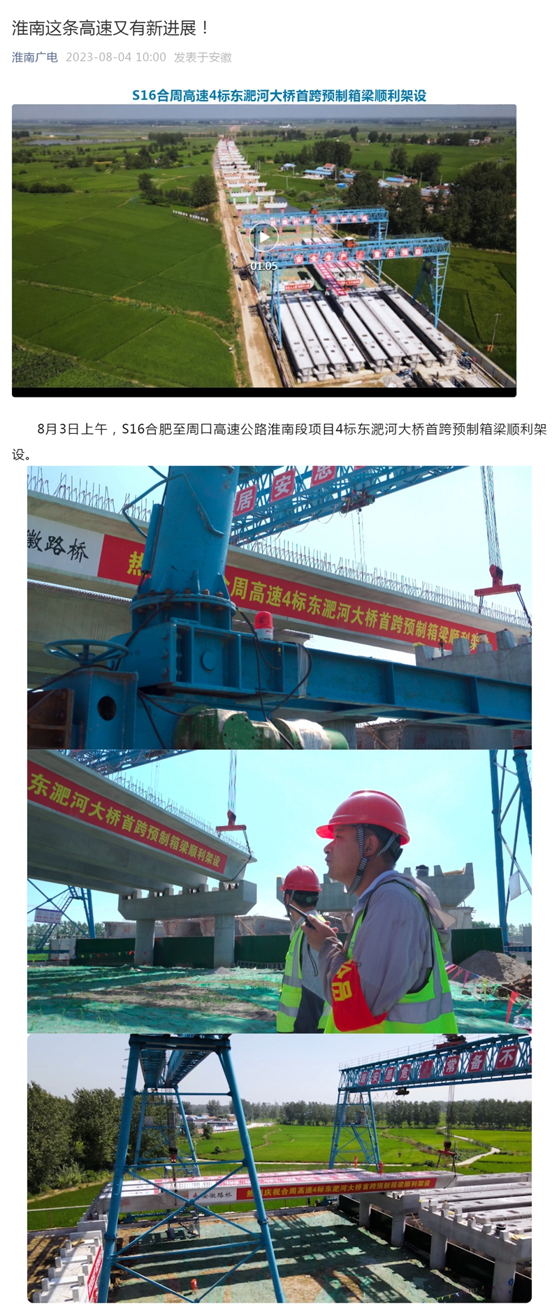 【名媒聚焦】淮南廣播電視臺——S16合周高速4標東淝河大橋首跨預制箱梁順利架設
