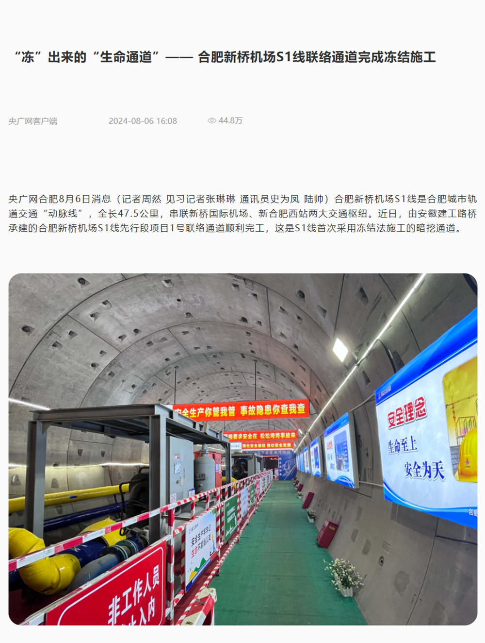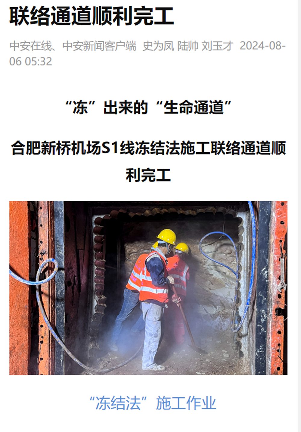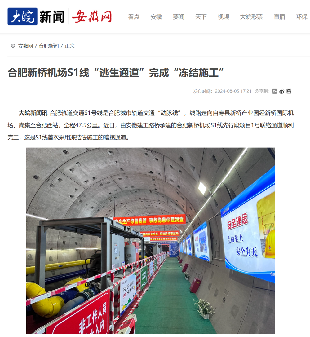 【名媒聚焦】央廣網、中安在線、大皖新聞:“凍”出來的“生命通道”——合肥新橋機場S1線凍結法施工聯絡通道順利完工
