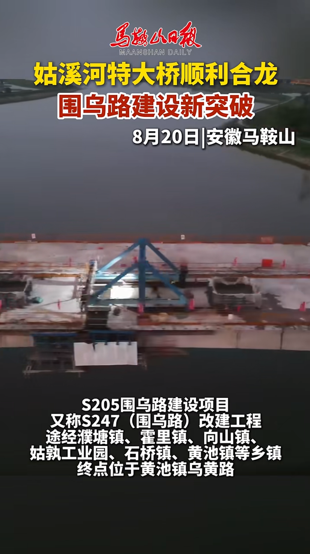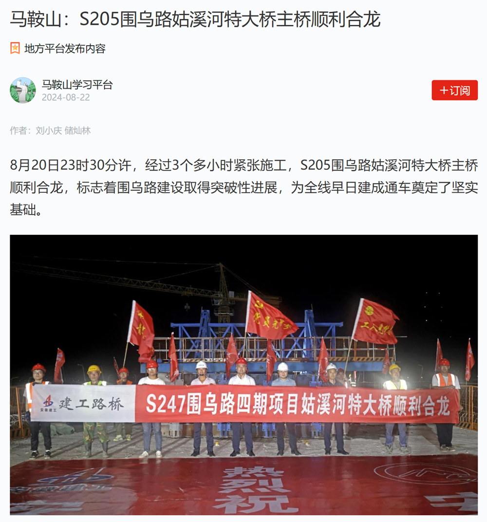 【名媒聚焦】央廣網(wǎng)、學習強國等主流媒體聚焦S247(圍烏路)改建工程四期姑溪河特大橋主橋順利合龍