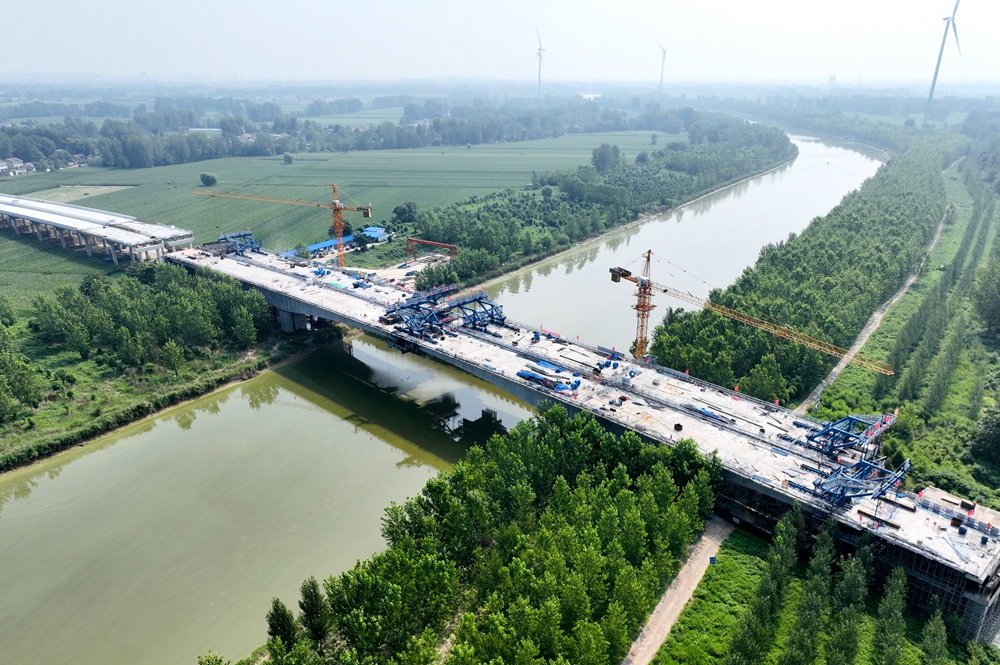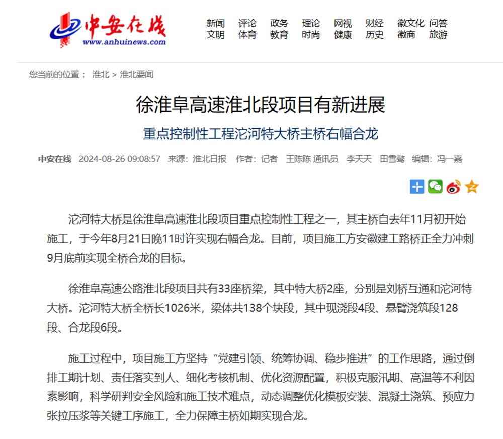 【名媒聚焦】中安在線、淮北電視臺(tái)、淮北日?qǐng)?bào)等主流媒體聚焦徐淮阜高速淮北段項(xiàng)目沱河特大橋主橋右幅合龍
