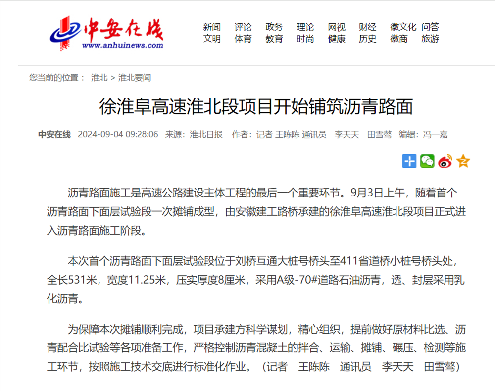 瀝青路面施工是高速公路建設主體工程的最后一個重要環(huán)節(jié)。9月3日上午,隨著首個瀝青路面下面層試驗段一次攤鋪成型,由安徽建工路橋承建的徐淮阜高速淮北段項目正式進入瀝青路面施工階段。