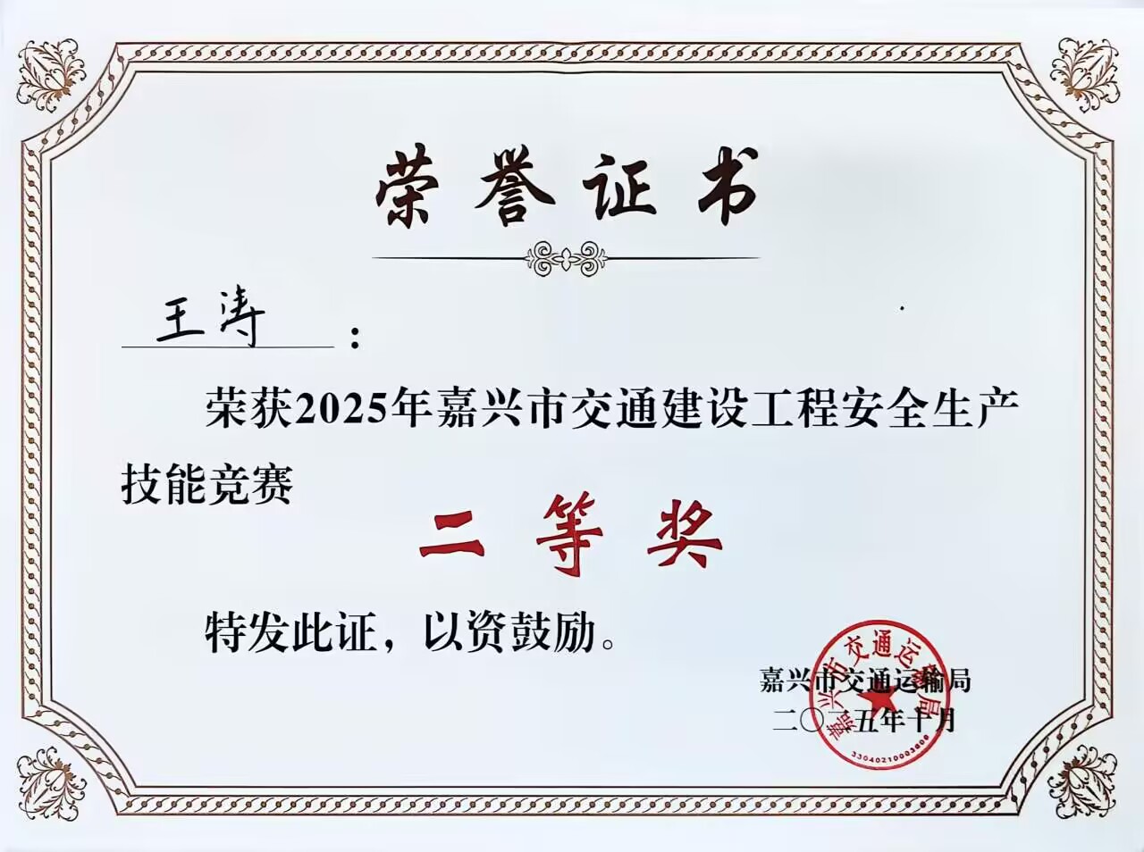10月30日,由嘉興市總工會(huì)、嘉興市交通運(yùn)輸局聯(lián)合舉辦的2025年嘉興市交通建設(shè)工程安全生產(chǎn)技能競(jìng)賽,在浙江分公司524國(guó)道TJ01標(biāo)項(xiàng)目圓滿舉行。項(xiàng)目精心選派的參賽選手王濤憑借出色發(fā)揮,榮獲二等獎(jiǎng)。