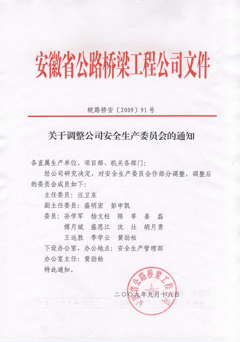 關(guān)于調(diào)整公司安全生產(chǎn)委員會(huì)的通知 發(fā)布時(shí)間:2009年09月21日 來(lái)源:安全生產(chǎn)部 發(fā)布人: 作者: 瀏覽:5414次