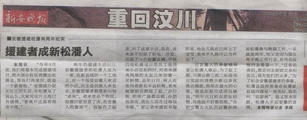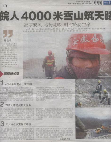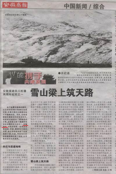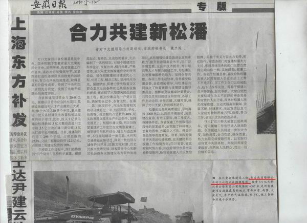在“5.12”汶川大地震發(fā)生兩周年之際,安徽省路橋公司承建的我省對(duì)口援建四川松潘縣項(xiàng)目之一——漳黃公路道路改建工程02標(biāo)再次引起省內(nèi)各大主流媒體的高度關(guān)注。2010年5月12日《安徽日?qǐng)?bào)》以專版形式發(fā)表了我省對(duì)口支援領(lǐng)導(dǎo)小組副組長、省政府秘書長梁衛(wèi)國文章《合力共建新松潘》,對(duì)安徽路橋在施工條件和環(huán)境十分艱苦的情況下表現(xiàn)出來的優(yōu)良政治品格給予了充分肯定。5月11日安徽電視臺(tái)第一時(shí)間欄目記者在海拔4000米以上的施工現(xiàn)場采訪了項(xiàng)目副經(jīng)理蔡少影同志。5月10日《新安晚報(bào)》、《安徽市場報(bào)》等均以專刊形式報(bào)道了公司援建項(xiàng)目。