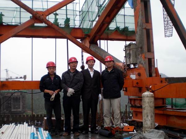 31日上午,在經(jīng)過整夜大雨后,天空依舊飄散著涼涼的細雨。盛總一行在項目總工胡學祥和項目副經(jīng)理張林的陪同下,對巖子腳大橋進行了認真的檢查,并冒雨登上高達74米的4號主墩施工現(xiàn)場。他就進行到掛藍施工階段的大橋與項目人員展開討論,對施工現(xiàn)場存在的施工難點和注意事項一一指出。盛總對項目部克服種種困難加緊施工作出了肯定。