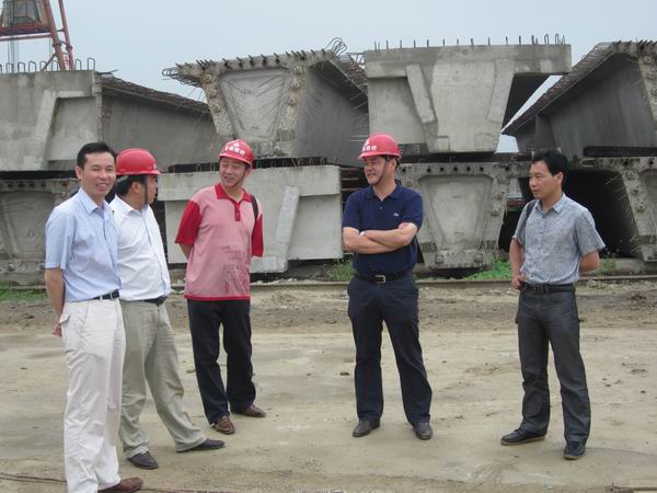 在徐明11標(biāo),戴總、郭總一行在公司總經(jīng)理助理兼項(xiàng)目經(jīng)理傅月斌的陪同下,先后對(duì)梁場(chǎng)、拌和站、鋼棧橋等施工現(xiàn)場(chǎng)進(jìn)行了視察。隨后,戴總一行在項(xiàng)目部召開會(huì)議。傅經(jīng)理就工程概況作了匯報(bào),重點(diǎn)介紹了質(zhì)量和安全措施落實(shí)情況。聽完匯報(bào)后,戴總對(duì)該部取得的成績(jī)表示肯定和祝賀,同時(shí)提出殷切希望:一、在原有精細(xì)化管理的基礎(chǔ)上精益求精,努力將該項(xiàng)目建設(shè)成為標(biāo)準(zhǔn)化工程;二、自我加壓,在質(zhì)量上樹立安徽路橋品牌;三、提煉管控理念,努力整理出一套可以推廣的經(jīng)營(yíng)管理模式。