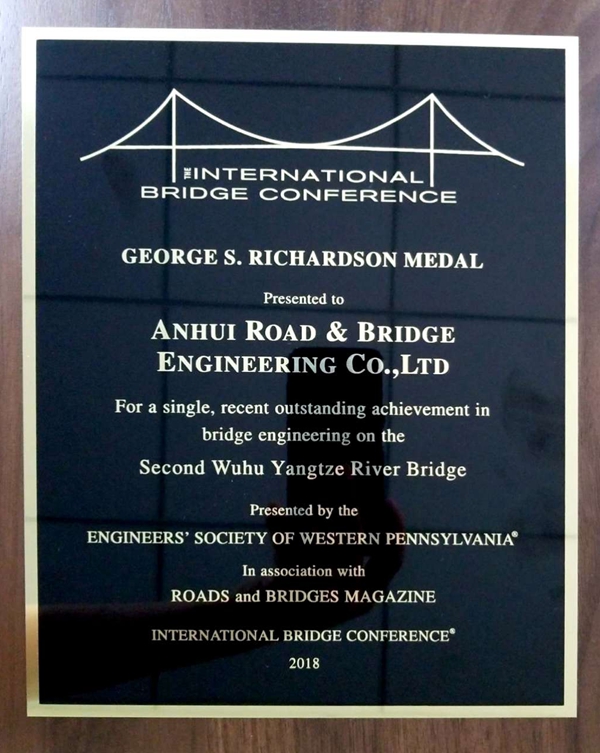 2018年6月,由公司參建的蕪湖長(zhǎng)江公路二橋榮獲第35屆國(guó)際橋梁大會(huì)(IBC)最高獎(jiǎng)——喬治·理查德森獎(jiǎng),這也是公司首次榮獲該項(xiàng)國(guó)際大獎(jiǎng)。