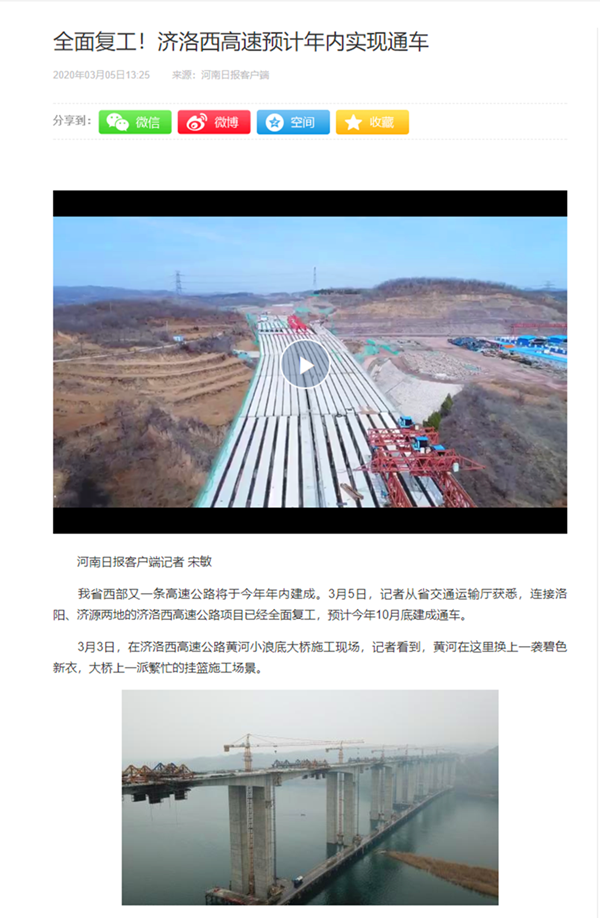 3月4日,公司承建的巢湖亞父路項目裕溪河大橋復工場景出現(xiàn)在人民網(wǎng)首頁,并刊文指出,為奪回疫情造成的停工損失,項目部嚴格落實防疫和生產(chǎn)要求,在保證安全質(zhì)量的前提下,加班加點趕施工進度,確保大橋按期建成通車。河南衛(wèi)視、鳳凰網(wǎng)等多家媒體記者走進公司承建的濟洛西高速黃河特大橋項目施工現(xiàn)場,實地采訪項目復工復產(chǎn)情況,并在中國網(wǎng)、河南日報客戶端、大河網(wǎng)進行了登載。安徽網(wǎng)聚焦G318池州至殷匯段改建工程復工建設,《今日宣州》以《按下交通建設“快進鍵”》為題專題報道了公司宣城PPP項目在疫情防控形勢逐漸向好的態(tài)勢下,搶抓建設黃金期,優(yōu)化調(diào)整復工隊伍和施工組織計劃,把因疫情耽誤的工期搶回來,確保項目如期完工,開啟了復工建設趕進度模式。