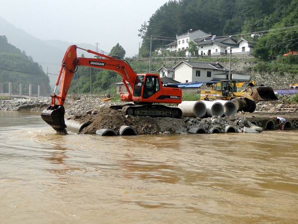 從27日開始,天氣放晴,水位下降,我部抓住機會進行第三次搶修,一臺挖機、一臺裝載機和五臺運輸車同時作業(yè),終于在28日上午打通便橋。項目部迅速組織人員把施工設(shè)備、施工材料調(diào)運到對面,28日下午恢復小型結(jié)構(gòu)物施工。
